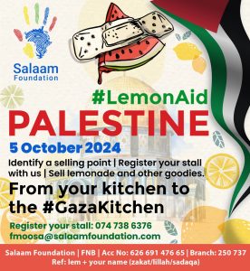 On October 5th, Salaam Foundation will be holding the 2024 edition of the LemonAid campaign with all proceeds from the pop-ups going towards the Gaza Kitchen. To find out more and to register a stall, contact Fatima Moosa at 0747386376 or fmoosa@salaamfoundation.com.